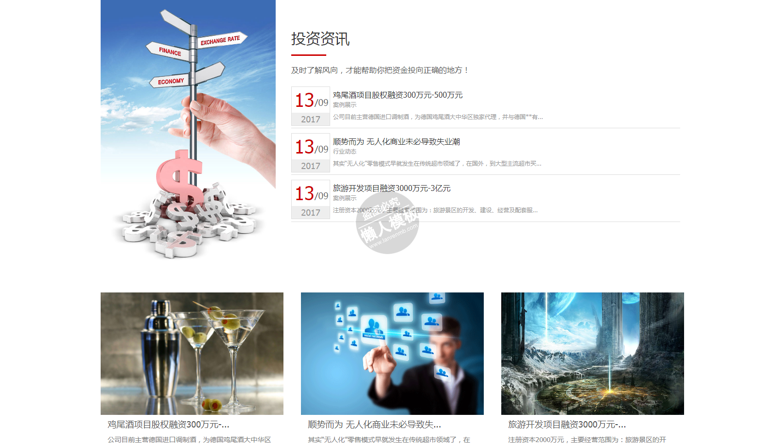 模板简介:该模板名称为【爱投资自适应响应式财经网站双模板下载】,大小是,文档格式为.,推荐使用打开,作品中的图片,文字等数据均可修改,图片请在作品中选中图片替换即可,文字修改直接点击文字修改即可,您也可以新增或修改作品中的内容,该模板来自用户分享,如有侵权行为请联系网站客服处理。欢迎来懒人模板【财经】栏目查找您需要的精美模板。