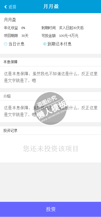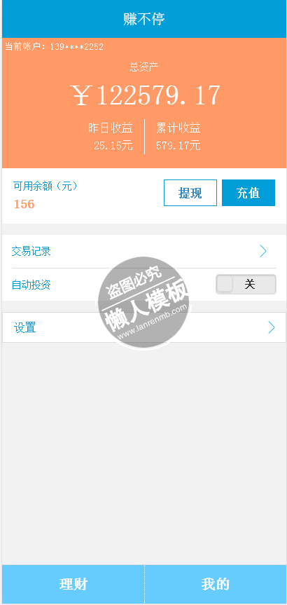 模板简介:该模板名称为【理财赚不停触屏版自适应手机wap财经网站模板下载】,大小是,文档格式为.,推荐使用打开,作品中的图片,文字等数据均可修改,图片请在作品中选中图片替换即可,文字修改直接点击文字修改即可,您也可以新增或修改作品中的内容,该模板来自用户分享,如有侵权行为请联系网站客服处理。欢迎来懒人模板【财经】栏目查找您需要的精美模板。