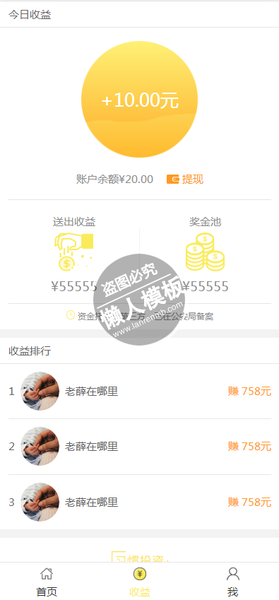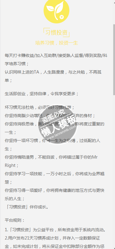 模板简介:该模板名称为【习惯投资赚收益触屏版自适应手机wap财经网站模板下载】,大小是,文档格式为.,推荐使用打开,作品中的图片,文字等数据均可修改,图片请在作品中选中图片替换即可,文字修改直接点击文字修改即可,您也可以新增或修改作品中的内容,该模板来自用户分享,如有侵权行为请联系网站客服处理。欢迎来懒人模板【财经】栏目查找您需要的精美模板。