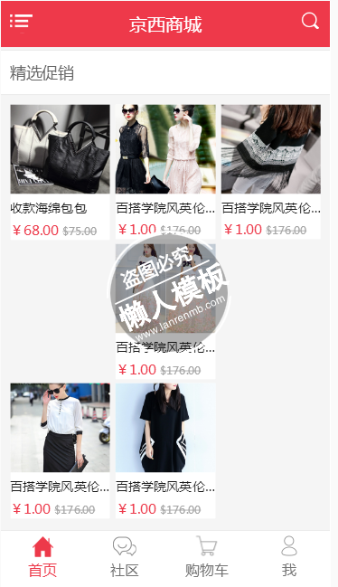 模板简介:该模板名称为【京西商城购物html5手机wap商城购物网站模板下载】,大小是,文档格式为.,推荐使用打开,作品中的图片,文字等数据均可修改,图片请在作品中选中图片替换即可,文字修改直接点击文字修改即可,您也可以新增或修改作品中的内容,该模板来自用户分享,如有侵权行为请联系网站客服处理。欢迎来懒人模板【购物】栏目查找您需要的精美模板。