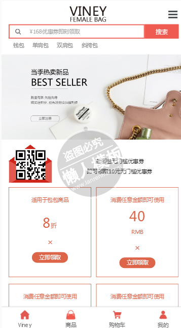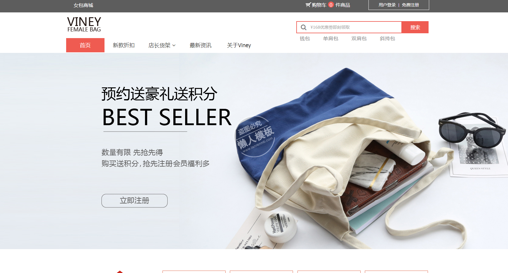 模板简介:该模板名称为【VINEY女包商城手机PC端商城网站双模板下载】,大小是,文档格式为.,推荐使用打开,作品中的图片,文字等数据均可修改,图片请在作品中选中图片替换即可,文字修改直接点击文字修改即可,您也可以新增或修改作品中的内容,该模板来自用户分享,如有侵权行为请联系网站客服处理。欢迎来懒人模板【购物】栏目查找您需要的精美模板。