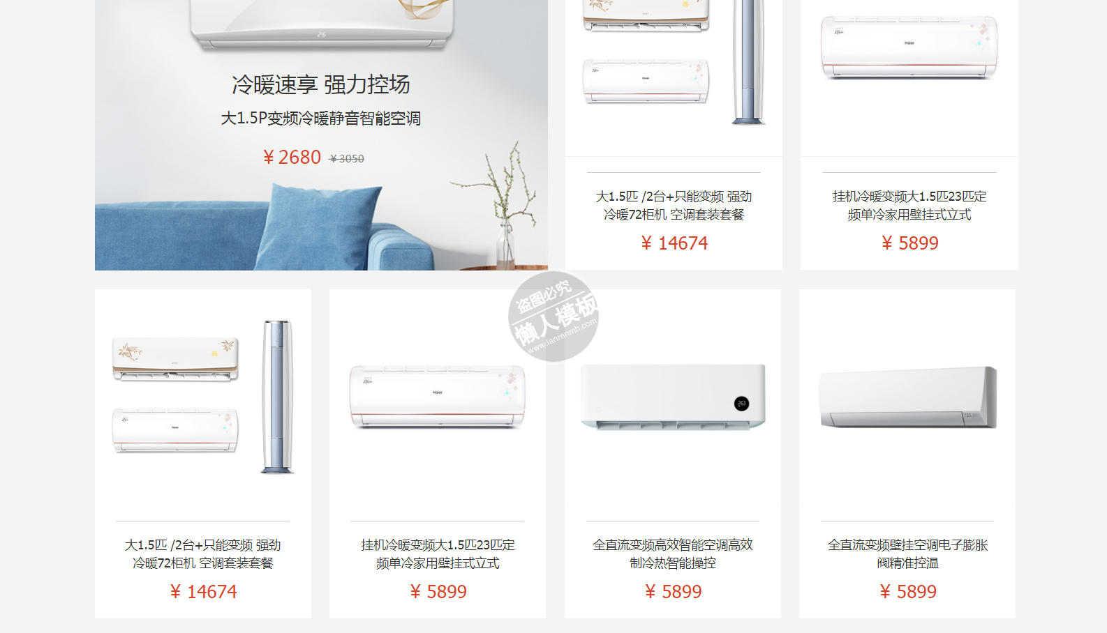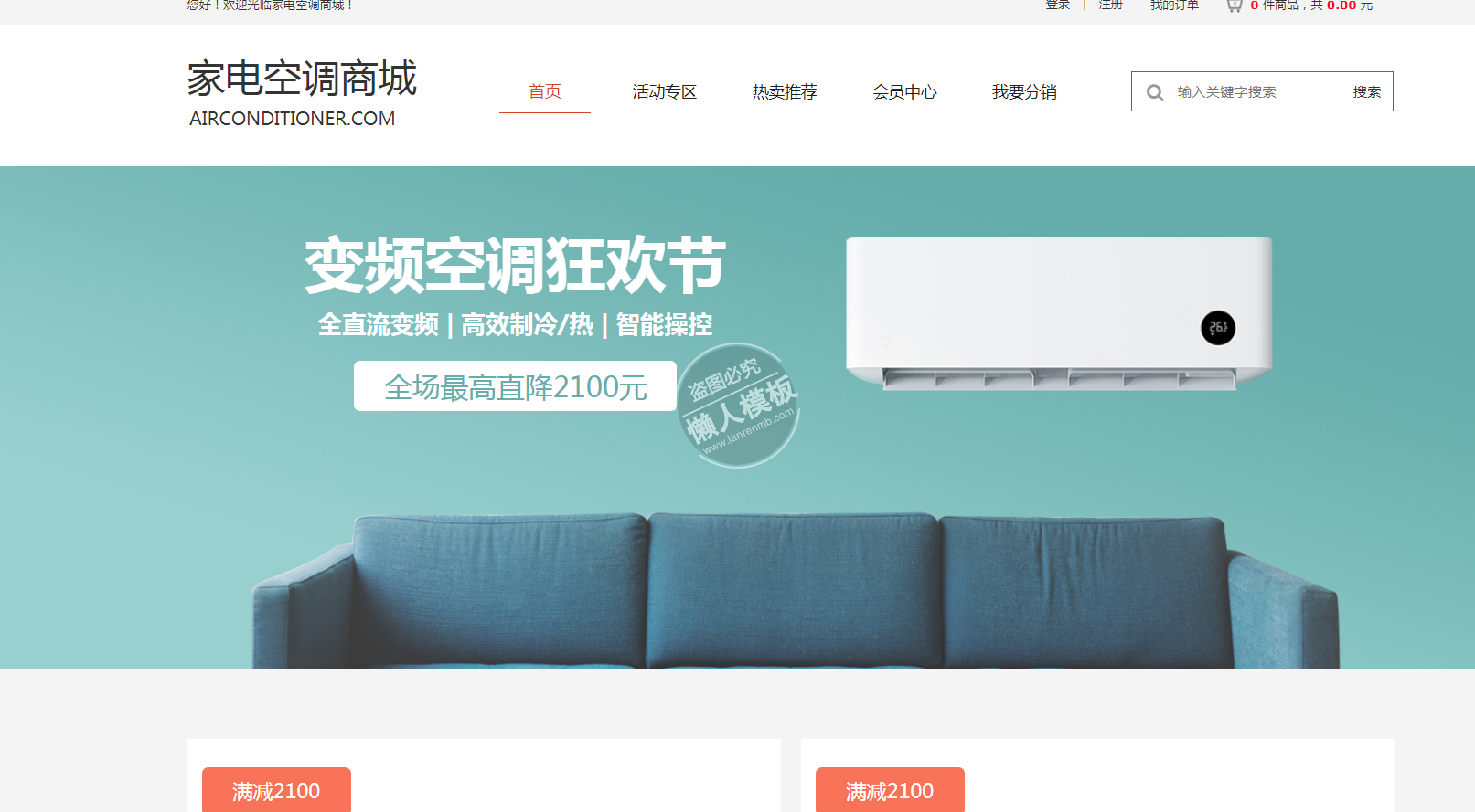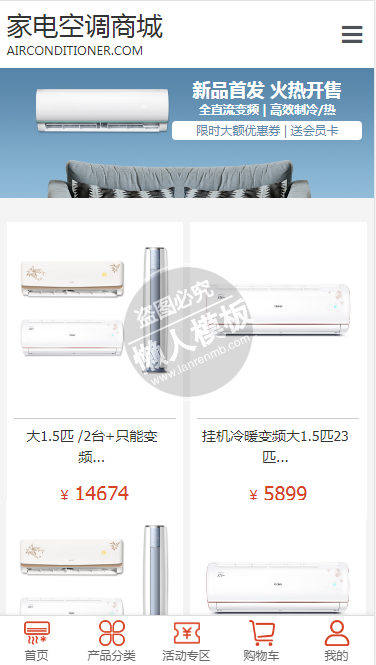 模板简介:该模板名称为【家电空调商城自适应响应式家电网站双模板下载】,大小是,文档格式为.,推荐使用打开,作品中的图片,文字等数据均可修改,图片请在作品中选中图片替换即可,文字修改直接点击文字修改即可,您也可以新增或修改作品中的内容,该模板来自用户分享,如有侵权行为请联系网站客服处理。欢迎来懒人模板【购物】栏目查找您需要的精美模板。