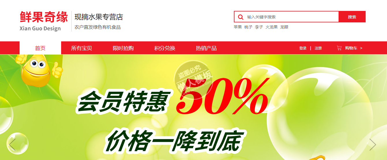 模板简介:该模板名称为【鲜果奇缘自适应响应式购物网站双模板下载】,大小是,文档格式为.,推荐使用打开,作品中的图片,文字等数据均可修改,图片请在作品中选中图片替换即可,文字修改直接点击文字修改即可,您也可以新增或修改作品中的内容,该模板来自用户分享,如有侵权行为请联系网站客服处理。欢迎来懒人模板【购物】栏目查找您需要的精美模板。