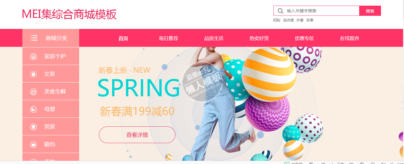 模板简介:该模板名称为【me集商城自适应响应式购物网站双模板下载】,大小是,文档格式为.,推荐使用打开,作品中的图片,文字等数据均可修改,图片请在作品中选中图片替换即可,文字修改直接点击文字修改即可,您也可以新增或修改作品中的内容,该模板来自用户分享,如有侵权行为请联系网站客服处理。欢迎来懒人模板【购物】栏目查找您需要的精美模板。