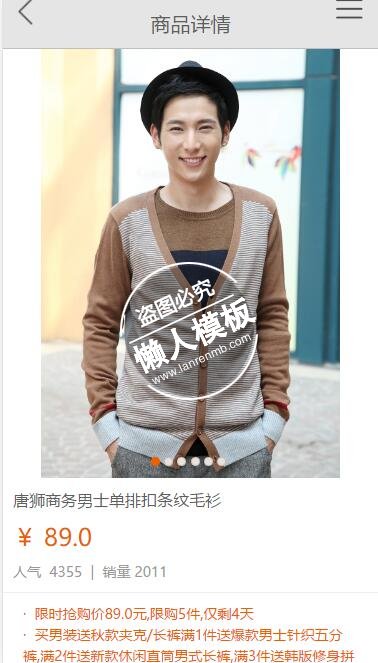模板简介:该模板名称为【买卖宝商城触屏版自适应手机wap购物网站模板下载】,大小是,文档格式为.,推荐使用打开,作品中的图片,文字等数据均可修改,图片请在作品中选中图片替换即可,文字修改直接点击文字修改即可,您也可以新增或修改作品中的内容,该模板来自用户分享,如有侵权行为请联系网站客服处理。欢迎来懒人模板【购物】栏目查找您需要的精美模板。