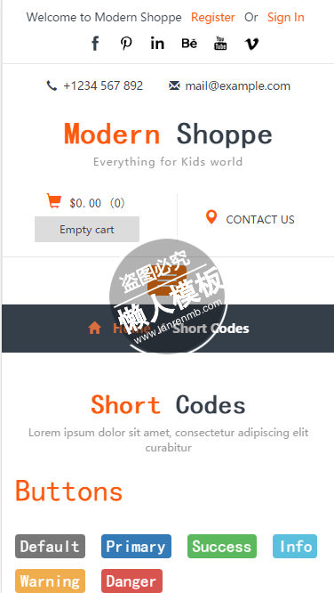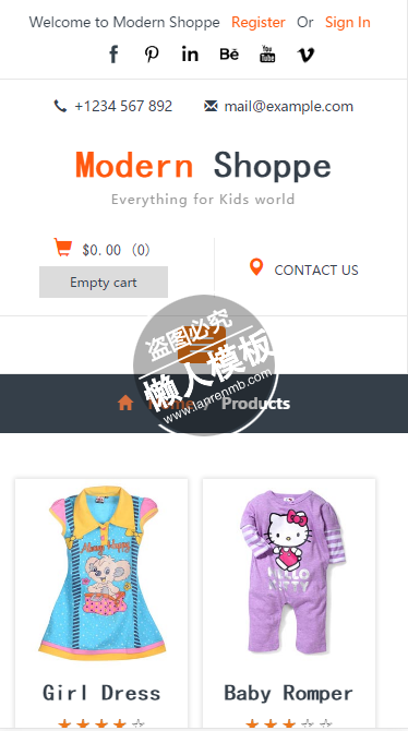 模板简介:该模板名称为【Modern Shoppe小孩衣物商店html5手机wap商城购物网站模板下载】,大小是,文档格式为.,推荐使用打开,作品中的图片,文字等数据均可修改,图片请在作品中选中图片替换即可,文字修改直接点击文字修改即可,您也可以新增或修改作品中的内容,该模板来自用户分享,如有侵权行为请联系网站客服处理。欢迎来懒人模板【购物】栏目查找您需要的精美模板。
