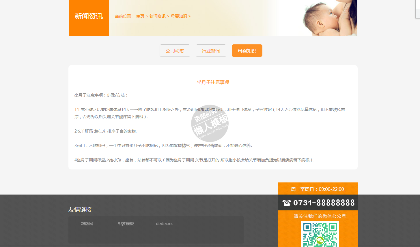 模板简介:该模板名称为【专业母婴护理育婴家政类网站整站带织梦后台pc网站源码下载】,大小是,文档格式为.,推荐使用打开,作品中的图片,文字等数据均可修改,图片请在作品中选中图片替换即可,文字修改直接点击文字修改即可,您也可以新增或修改作品中的内容,该模板来自用户分享,如有侵权行为请联系网站客服处理。欢迎来懒人模板【健康】栏目查找您需要的精美模板。