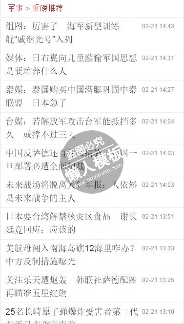模板简介:该模板名称为【手机人民军事网触屏版自适应手机wap军事网站模板下载】,大小是,文档格式为.,推荐使用打开,作品中的图片,文字等数据均可修改,图片请在作品中选中图片替换即可,文字修改直接点击文字修改即可,您也可以新增或修改作品中的内容,该模板来自用户分享,如有侵权行为请联系网站客服处理。欢迎来懒人模板【军事】栏目查找您需要的精美模板。