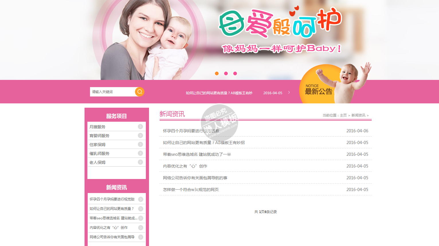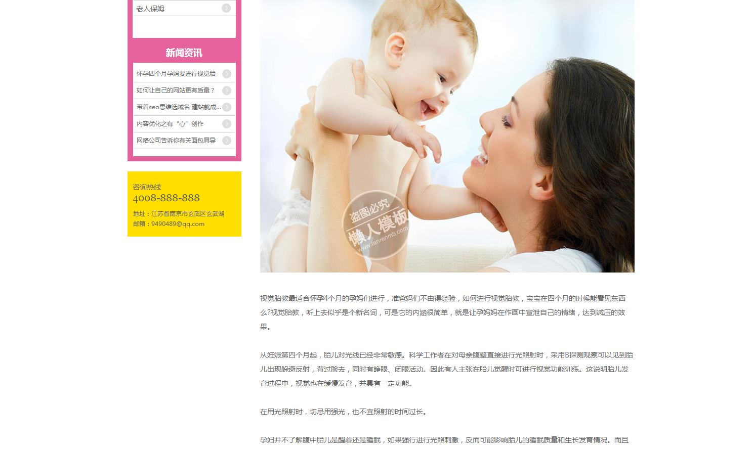 模板简介:该模板名称为【粉色界面育婴家政类网站整站带织梦后台pc网站源码下载】,大小是,文档格式为.,推荐使用打开,作品中的图片,文字等数据均可修改,图片请在作品中选中图片替换即可,文字修改直接点击文字修改即可,您也可以新增或修改作品中的内容,该模板来自用户分享,如有侵权行为请联系网站客服处理。欢迎来懒人模板【门户】栏目查找您需要的精美模板。