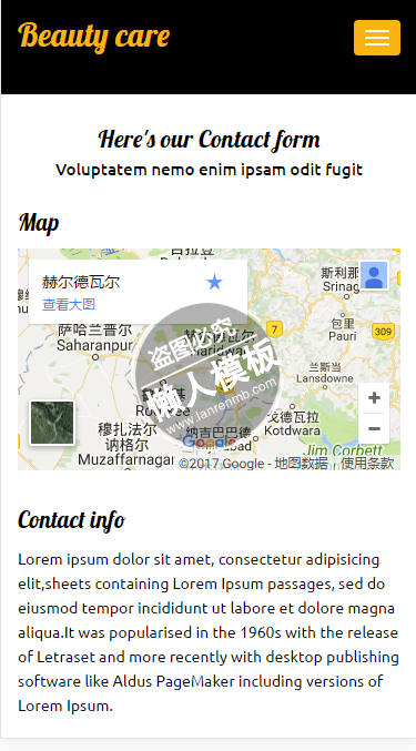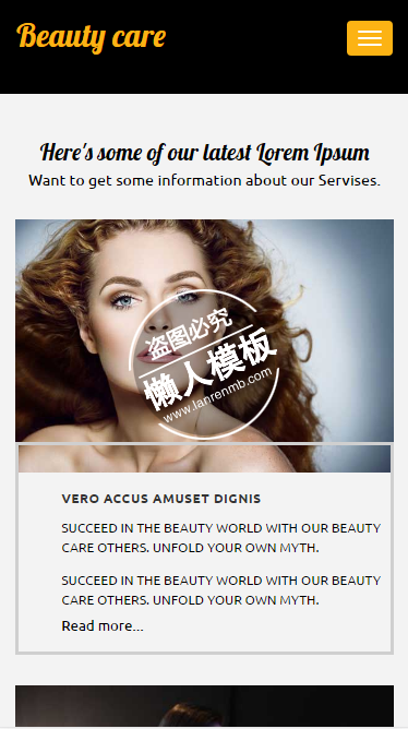 模板简介:该模板名称为【Beauty care美容spa html5手机wap美容美发女性网站模板免费下载】,大小是,文档格式为.,推荐使用打开,作品中的图片,文字等数据均可修改,图片请在作品中选中图片替换即可,文字修改直接点击文字修改即可,您也可以新增或修改作品中的内容,该模板来自用户分享,如有侵权行为请联系网站客服处理。欢迎来懒人模板【女性】栏目查找您需要的精美模板。