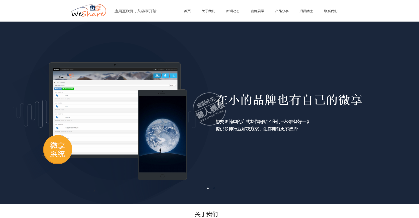 模板简介:该模板名称为【微信科技微享类网站整站带织梦后台pc手机双网站源码下载】,大小是,文档格式为.,推荐使用打开,作品中的图片,文字等数据均可修改,图片请在作品中选中图片替换即可,文字修改直接点击文字修改即可,您也可以新增或修改作品中的内容,该模板来自用户分享,如有侵权行为请联系网站客服处理。欢迎来懒人模板【企业】栏目查找您需要的精美模板。