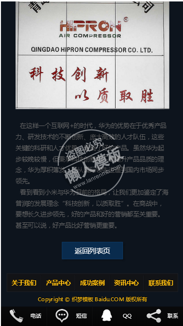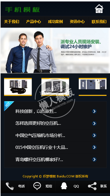 模板简介:该模板名称为【黑色主题空压机企业网站整站带织梦后台手机网站源码下载】,大小是,文档格式为.,推荐使用打开,作品中的图片,文字等数据均可修改,图片请在作品中选中图片替换即可,文字修改直接点击文字修改即可,您也可以新增或修改作品中的内容,该模板来自用户分享,如有侵权行为请联系网站客服处理。欢迎来懒人模板【企业】栏目查找您需要的精美模板。