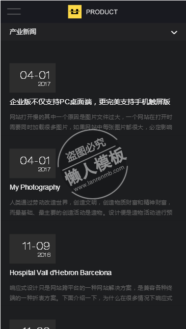 模板简介:该模板名称为【屏炫酷电子产品展示类网站整站带织梦后台pc手机双网站源码下载】,大小是,文档格式为.,推荐使用打开,作品中的图片,文字等数据均可修改,图片请在作品中选中图片替换即可,文字修改直接点击文字修改即可,您也可以新增或修改作品中的内容,该模板来自用户分享,如有侵权行为请联系网站客服处理。欢迎来懒人模板【企业】栏目查找您需要的精美模板。