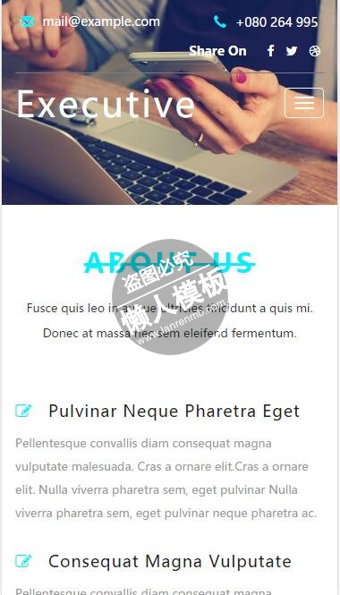 模板简介:该模板名称为【Executive团体合作介绍html5公司企业手机wap网站模板免费下载】,大小是,文档格式为.,推荐使用打开,作品中的图片,文字等数据均可修改,图片请在作品中选中图片替换即可,文字修改直接点击文字修改即可,您也可以新增或修改作品中的内容,该模板来自用户分享,如有侵权行为请联系网站客服处理。欢迎来懒人模板【企业】栏目查找您需要的精美模板。