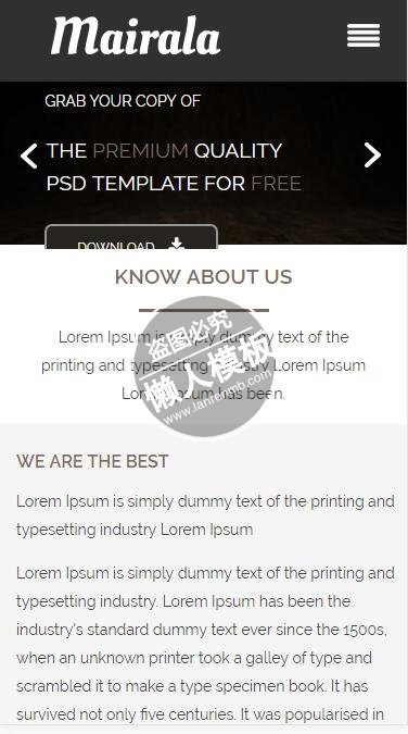 模板简介:该模板名称为【Mairala黑色简单文字设计单页html5公司企业手机网站模板免费下载】,大小是,文档格式为.,推荐使用打开,作品中的图片,文字等数据均可修改,图片请在作品中选中图片替换即可,文字修改直接点击文字修改即可,您也可以新增或修改作品中的内容,该模板来自用户分享,如有侵权行为请联系网站客服处理。欢迎来懒人模板【企业】栏目查找您需要的精美模板。