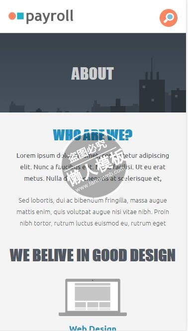 模板简介:该模板名称为【Payroll好设计就是好商品html5公司企业手机wap网站模板免费下载】,大小是,文档格式为.,推荐使用打开,作品中的图片,文字等数据均可修改,图片请在作品中选中图片替换即可,文字修改直接点击文字修改即可,您也可以新增或修改作品中的内容,该模板来自用户分享,如有侵权行为请联系网站客服处理。欢迎来懒人模板【企业】栏目查找您需要的精美模板。