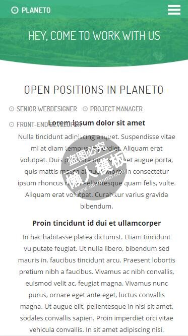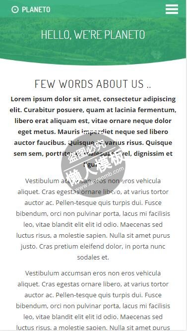 模板简介:该模板名称为【Planeto绿色背景网站服务html5公司企业手机wap网站模板免费下载】,大小是,文档格式为.,推荐使用打开,作品中的图片,文字等数据均可修改,图片请在作品中选中图片替换即可,文字修改直接点击文字修改即可,您也可以新增或修改作品中的内容,该模板来自用户分享,如有侵权行为请联系网站客服处理。欢迎来懒人模板【企业】栏目查找您需要的精美模板。