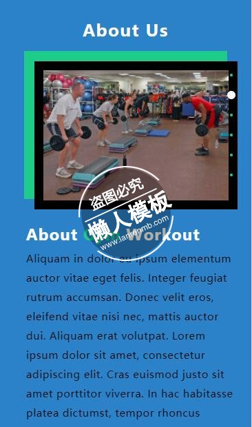 模板简介:该模板名称为【Gym Workout蓝色版块滑动单页html5手机wap体育网站模板免费下载】,大小是,文档格式为.,推荐使用打开,作品中的图片,文字等数据均可修改,图片请在作品中选中图片替换即可,文字修改直接点击文字修改即可,您也可以新增或修改作品中的内容,该模板来自用户分享,如有侵权行为请联系网站客服处理。欢迎来懒人模板【体育】栏目查找您需要的精美模板。