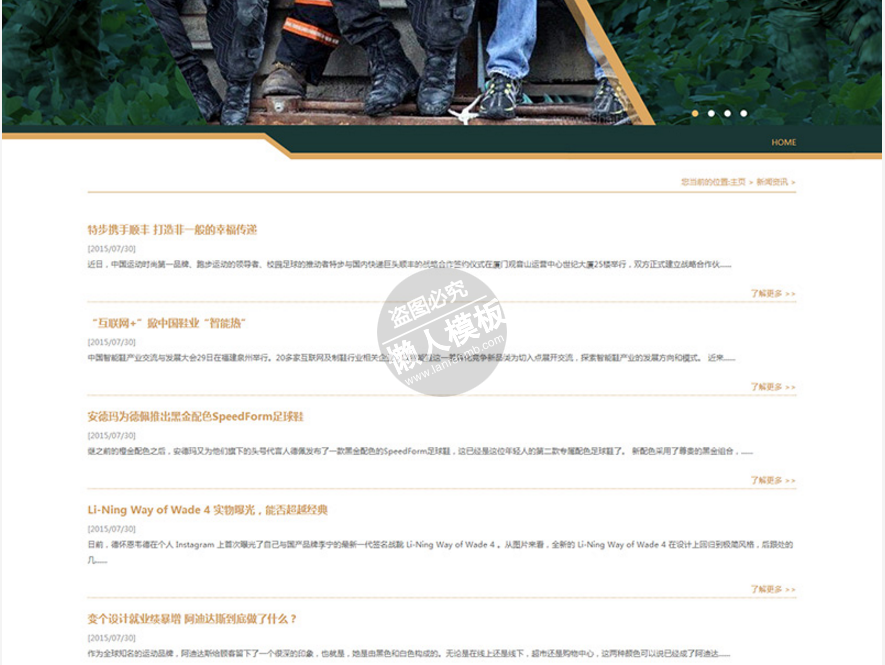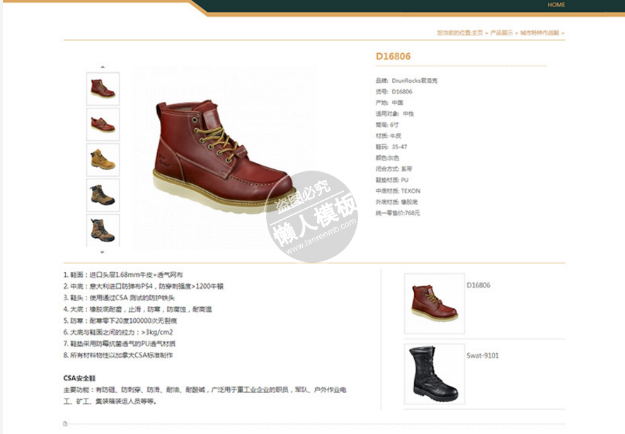 模板简介:该模板名称为【军绿色品牌鞋业鞋类行业公司整站带织梦后台pc网站源码下载】,大小是,文档格式为.,推荐使用打开,作品中的图片,文字等数据均可修改,图片请在作品中选中图片替换即可,文字修改直接点击文字修改即可,您也可以新增或修改作品中的内容,该模板来自用户分享,如有侵权行为请联系网站客服处理。欢迎来懒人模板【鞋帽】栏目查找您需要的精美模板。