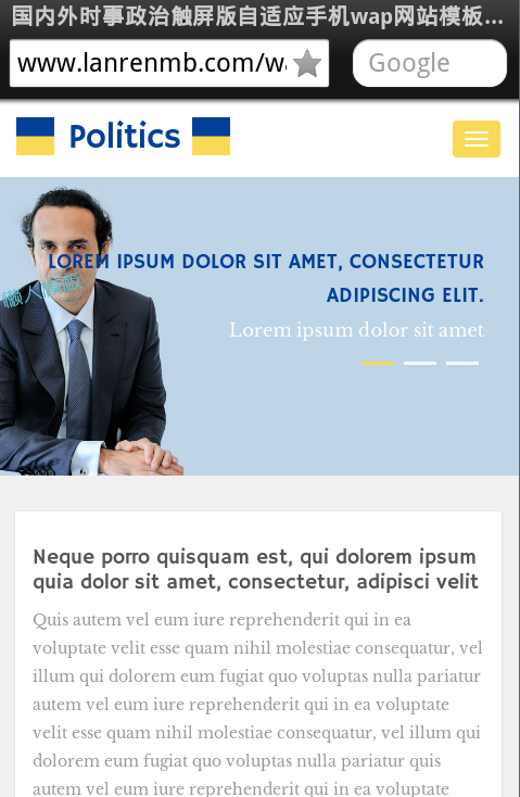 模板简介:该模板名称为【国内外时事政治触屏版自适应手机wap网站模板源码下载】,大小是,文档格式为.,推荐使用打开,作品中的图片,文字等数据均可修改,图片请在作品中选中图片替换即可,文字修改直接点击文字修改即可,您也可以新增或修改作品中的内容,该模板来自用户分享,如有侵权行为请联系网站客服处理。欢迎来懒人模板【新闻】栏目查找您需要的精美模板。