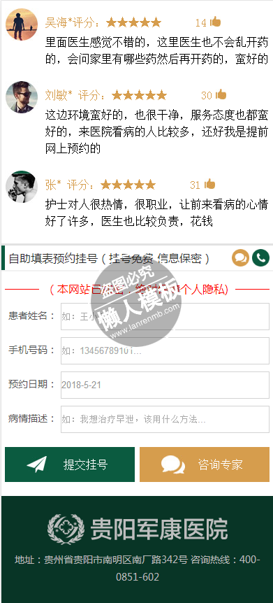 模板简介:该模板名称为【贵阳军康医院官方网站单页html5手机专题单页网站模板源码下载】,大小是,文档格式为.,推荐使用打开,作品中的图片,文字等数据均可修改,图片请在作品中选中图片替换即可,文字修改直接点击文字修改即可,您也可以新增或修改作品中的内容,该模板来自用户分享,如有侵权行为请联系网站客服处理。欢迎来懒人模板【医院】栏目查找您需要的精美模板。