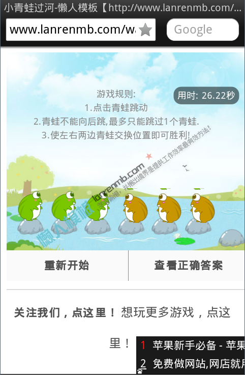 模板简介:该模板名称为【微信朋友圈【小青蛙过河】html5小游戏源码】,大小是,文档格式为.,推荐使用打开,作品中的图片,文字等数据均可修改,图片请在作品中选中图片替换即可,文字修改直接点击文字修改即可,您也可以新增或修改作品中的内容,该模板来自用户分享,如有侵权行为请联系网站客服处理。欢迎来懒人模板【微测试】栏目查找您需要的精美模板。