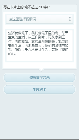 模板简介:该模板名称为【微信htlm5囚鸟电子贺卡怎么制作免费模板源码下载】,大小是,文档格式为.,推荐使用打开,作品中的图片,文字等数据均可修改,图片请在作品中选中图片替换即可,文字修改直接点击文字修改即可,您也可以新增或修改作品中的内容,该模板来自用户分享,如有侵权行为请联系网站客服处理。欢迎来懒人模板【微官网】栏目查找您需要的精美模板。