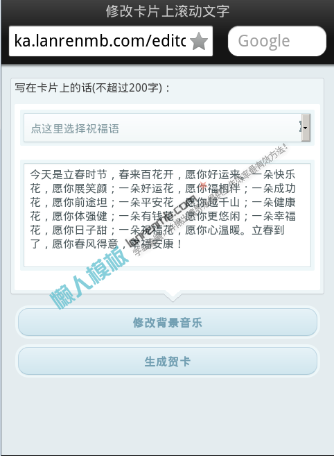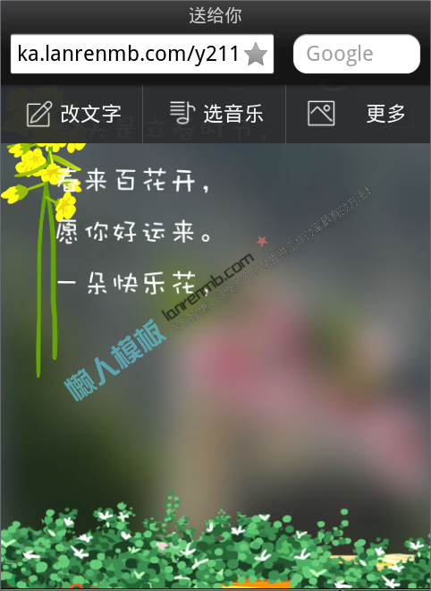 模板简介:该模板名称为【微信htlm5春的祝福电子贺卡怎么制作免费模板源码下载】,大小是,文档格式为.,推荐使用打开,作品中的图片,文字等数据均可修改,图片请在作品中选中图片替换即可,文字修改直接点击文字修改即可,您也可以新增或修改作品中的内容,该模板来自用户分享,如有侵权行为请联系网站客服处理。欢迎来懒人模板【微官网】栏目查找您需要的精美模板。