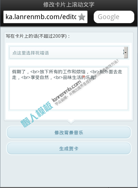 模板简介:该模板名称为【微信htlm5出去走走电子贺卡怎么制作免费模板源码下载】,大小是,文档格式为.,推荐使用打开,作品中的图片,文字等数据均可修改,图片请在作品中选中图片替换即可,文字修改直接点击文字修改即可,您也可以新增或修改作品中的内容,该模板来自用户分享,如有侵权行为请联系网站客服处理。欢迎来懒人模板【微官网】栏目查找您需要的精美模板。