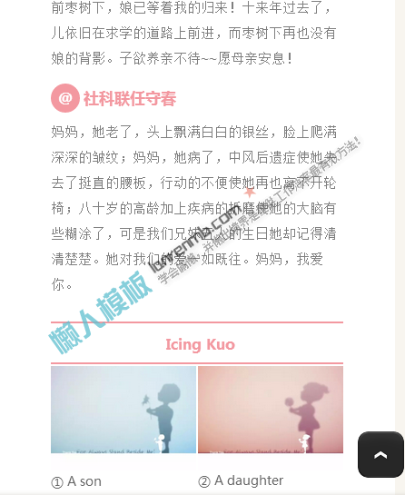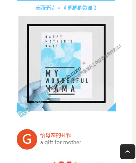 模板简介:该模板名称为【微信公众平台编辑器致母亲的礼物正文文章图文模板素材库】,大小是,文档格式为.,推荐使用打开,作品中的图片,文字等数据均可修改,图片请在作品中选中图片替换即可,文字修改直接点击文字修改即可,您也可以新增或修改作品中的内容,该模板来自用户分享,如有侵权行为请联系网站客服处理。欢迎来懒人模板【微信素材】栏目查找您需要的精美模板。