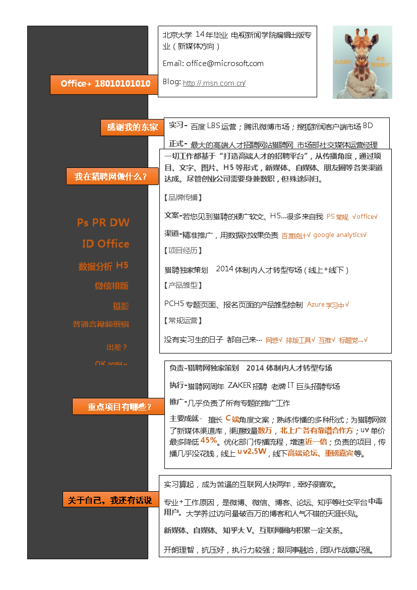 模板简介:该模板名称为【创意内容中文带照片新媒体方向类个人简历模板免费下载】,大小是,文档格式为.,推荐使用打开,作品中的图片,文字等数据均可修改,图片请在作品中选中图片替换即可,文字修改直接点击文字修改即可,您也可以新增或修改作品中的内容,该模板来自用户分享,如有侵权行为请联系网站客服处理。欢迎来懒人模板【编辑类】栏目查找您需要的精美模板。