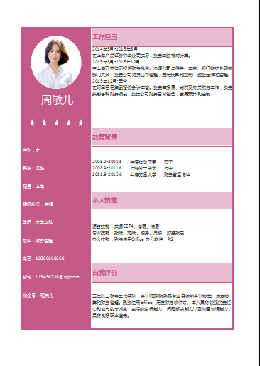 模板简介:该模板名称为【单页粉色可爱清纯财务会计类个人简历模板免费下载】,大小是,文档格式为.,推荐使用打开,作品中的图片,文字等数据均可修改,图片请在作品中选中图片替换即可,文字修改直接点击文字修改即可,您也可以新增或修改作品中的内容,该模板来自用户分享,如有侵权行为请联系网站客服处理。欢迎来懒人模板【财务会计出纳】栏目查找您需要的精美模板。