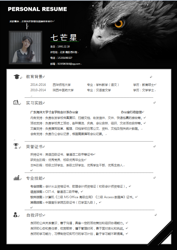 模板简介:该模板名称为【鹰背景样式应届生教育培训类个人简历模板免费下载】,大小是,文档格式为.,推荐使用打开,作品中的图片,文字等数据均可修改,图片请在作品中选中图片替换即可,文字修改直接点击文字修改即可,您也可以新增或修改作品中的内容,该模板来自用户分享,如有侵权行为请联系网站客服处理。欢迎来懒人模板【教育培训老师】栏目查找您需要的精美模板。