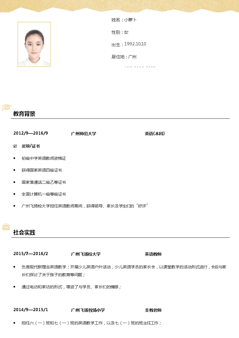 模板简介:该模板名称为【黄色背景单页式罗列式英语老师简历模板免费下载】,大小是,文档格式为.,推荐使用打开,作品中的图片,文字等数据均可修改,图片请在作品中选中图片替换即可,文字修改直接点击文字修改即可,您也可以新增或修改作品中的内容,该模板来自用户分享,如有侵权行为请联系网站客服处理。欢迎来懒人模板【教育培训老师】栏目查找您需要的精美模板。