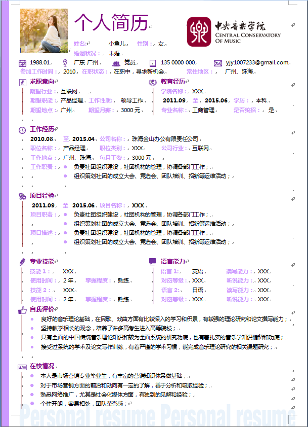 模板简介:该模板名称为【淡紫色边框中文带照片市场营销类个人简历模板免费下载】,大小是,文档格式为.,推荐使用打开,作品中的图片,文字等数据均可修改,图片请在作品中选中图片替换即可,文字修改直接点击文字修改即可,您也可以新增或修改作品中的内容,该模板来自用户分享,如有侵权行为请联系网站客服处理。欢迎来懒人模板【市场营销】栏目查找您需要的精美模板。
