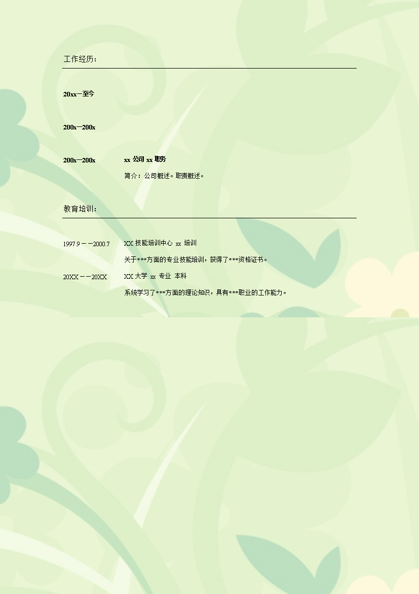 模板简介:该模板名称为【绿色花朵多页式罗列式通用空白简历模板免费下载】,大小是,文档格式为.,推荐使用打开,作品中的图片,文字等数据均可修改,图片请在作品中选中图片替换即可,文字修改直接点击文字修改即可,您也可以新增或修改作品中的内容,该模板来自用户分享,如有侵权行为请联系网站客服处理。欢迎来懒人模板【通用】栏目查找您需要的精美模板。
