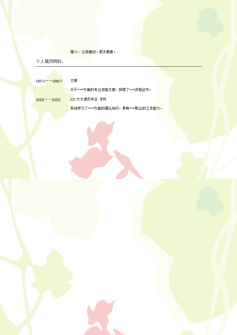 模板简介:该模板名称为【绿色树叶纹理背景多页式罗列式通用空白简历模板免费下载】,大小是,文档格式为.,推荐使用打开,作品中的图片,文字等数据均可修改,图片请在作品中选中图片替换即可,文字修改直接点击文字修改即可,您也可以新增或修改作品中的内容,该模板来自用户分享,如有侵权行为请联系网站客服处理。欢迎来懒人模板【通用】栏目查找您需要的精美模板。