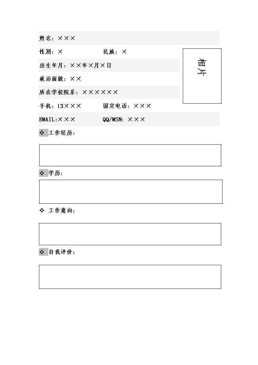 模板简介:该模板名称为【绘画正装封面单页式表格式通用空白简历模板免费下载】,大小是,文档格式为.,推荐使用打开,作品中的图片,文字等数据均可修改,图片请在作品中选中图片替换即可,文字修改直接点击文字修改即可,您也可以新增或修改作品中的内容,该模板来自用户分享,如有侵权行为请联系网站客服处理。欢迎来懒人模板【通用】栏目查找您需要的精美模板。