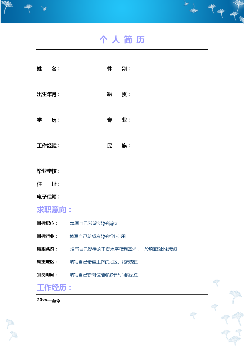 模板简介:该模板名称为【蓝色背景蒲公英封面多页式通用空白简历模板免费下载】,大小是,文档格式为.,推荐使用打开,作品中的图片,文字等数据均可修改,图片请在作品中选中图片替换即可,文字修改直接点击文字修改即可,您也可以新增或修改作品中的内容,该模板来自用户分享,如有侵权行为请联系网站客服处理。欢迎来懒人模板【通用】栏目查找您需要的精美模板。
