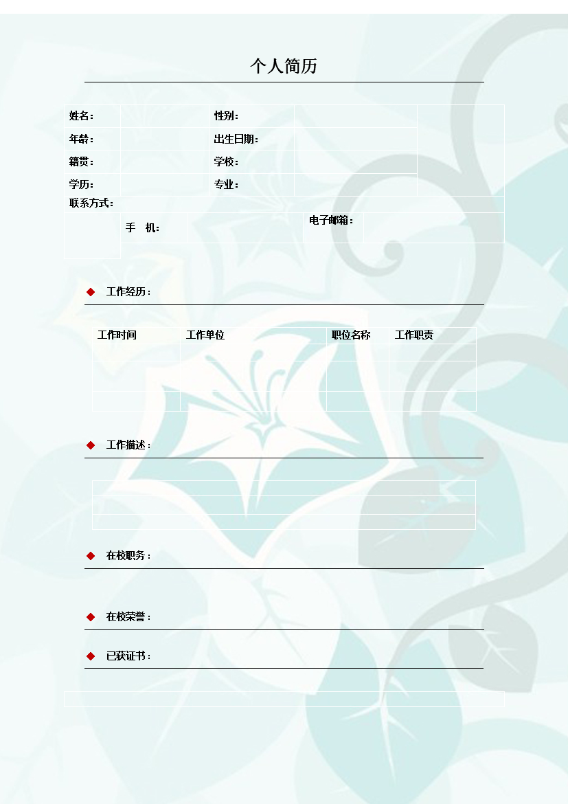 模板简介:该模板名称为【素净夕颜罗列式多页式无内容有封面个人简历模板免费下载】,大小是,文档格式为.,推荐使用打开,作品中的图片,文字等数据均可修改,图片请在作品中选中图片替换即可,文字修改直接点击文字修改即可,您也可以新增或修改作品中的内容,该模板来自用户分享,如有侵权行为请联系网站客服处理。欢迎来懒人模板【应届生毕业生】栏目查找您需要的精美模板。