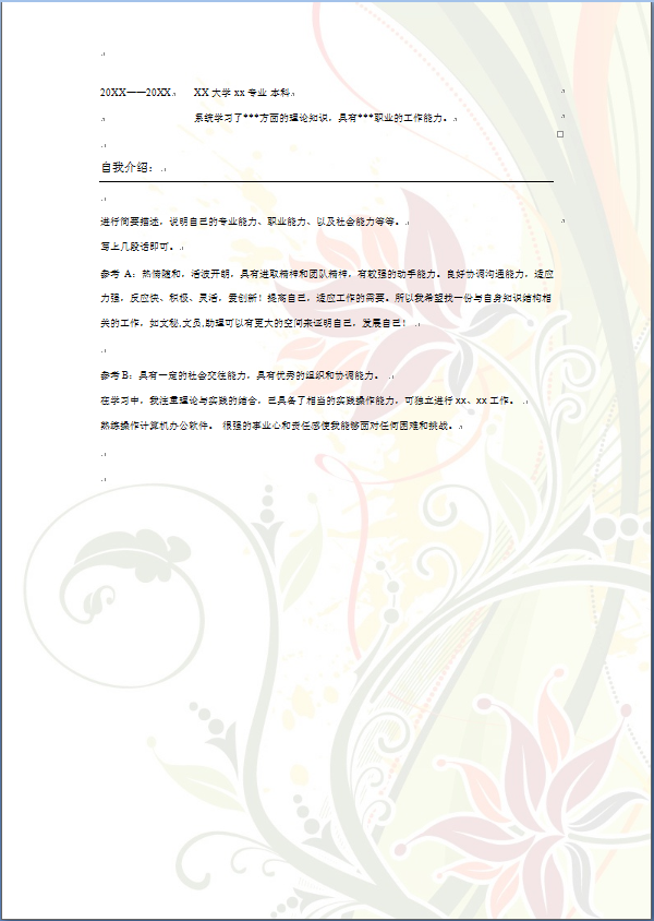 模板简介:该模板名称为【简洁花朵表格式应届生通用个人简历模板免费下载】,大小是,文档格式为.,推荐使用打开,作品中的图片,文字等数据均可修改,图片请在作品中选中图片替换即可,文字修改直接点击文字修改即可,您也可以新增或修改作品中的内容,该模板来自用户分享,如有侵权行为请联系网站客服处理。欢迎来懒人模板【应届生毕业生】栏目查找您需要的精美模板。