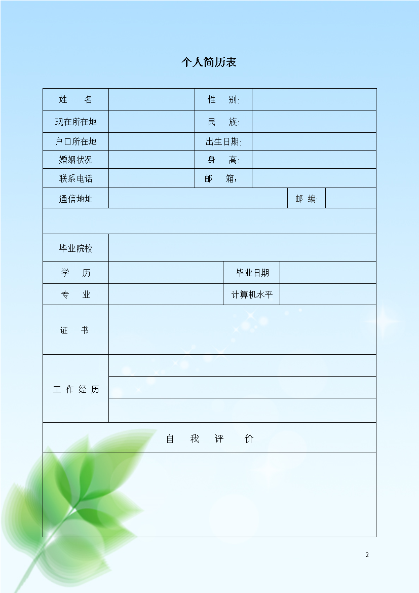 模板简介:该模板名称为【清新叶子表格式有封面多页式个人简历模板】,大小是,文档格式为.,推荐使用打开,作品中的图片,文字等数据均可修改,图片请在作品中选中图片替换即可,文字修改直接点击文字修改即可,您也可以新增或修改作品中的内容,该模板来自用户分享,如有侵权行为请联系网站客服处理。欢迎来懒人模板【应届生毕业生】栏目查找您需要的精美模板。