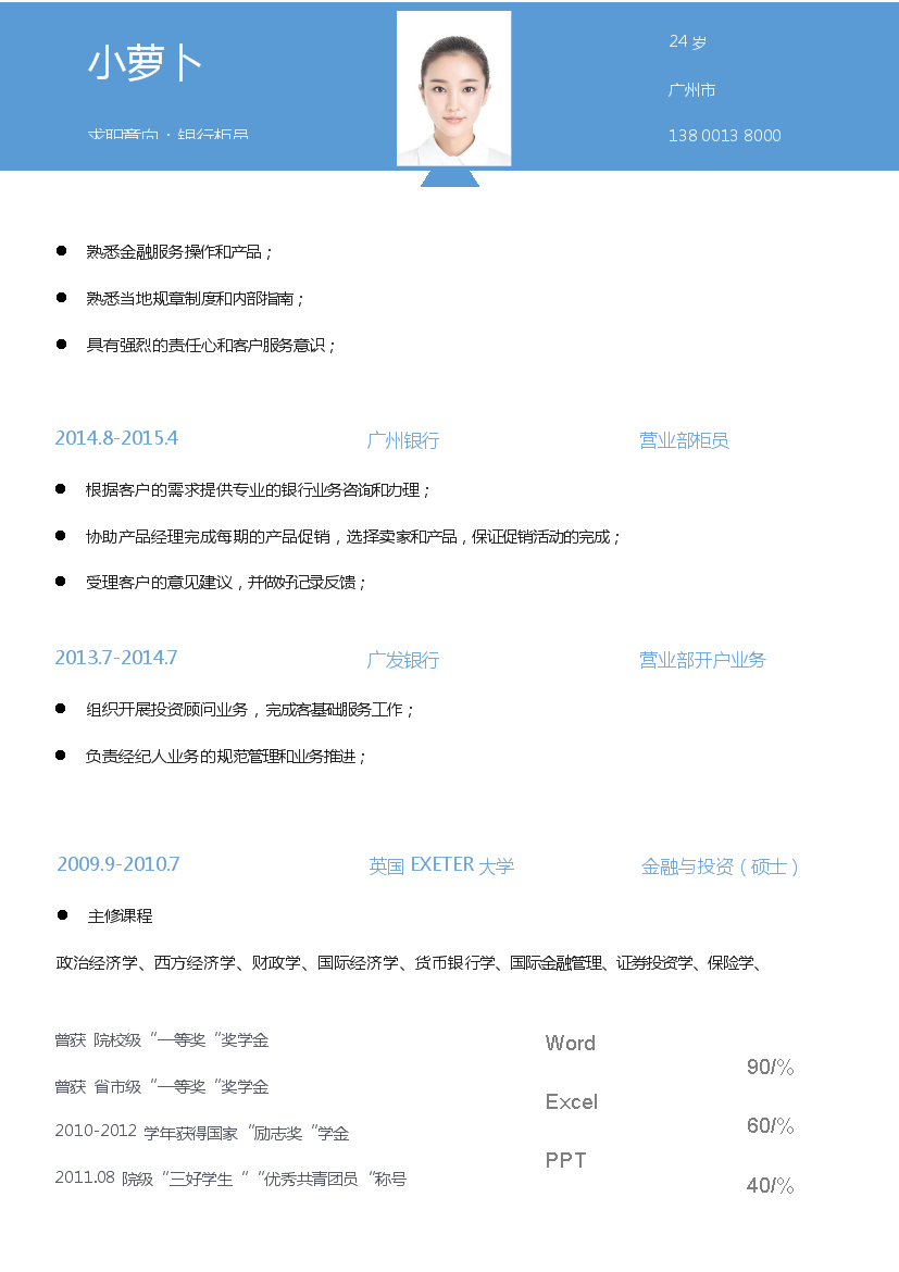 模板简介:该模板名称为【蓝色头部单页式罗列式银行柜员简历模板免费下载】,大小是,文档格式为.,推荐使用打开,作品中的图片,文字等数据均可修改,图片请在作品中选中图片替换即可,文字修改直接点击文字修改即可,您也可以新增或修改作品中的内容,该模板来自用户分享,如有侵权行为请联系网站客服处理。欢迎来懒人模板【银行信贷】栏目查找您需要的精美模板。