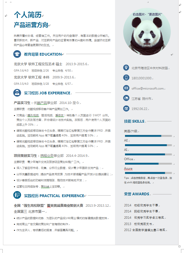 模板简介:该模板名称为【欧美风简洁中文单页产品运营类个人简历模板免费下载】,大小是,文档格式为.,推荐使用打开,作品中的图片,文字等数据均可修改,图片请在作品中选中图片替换即可,文字修改直接点击文字修改即可,您也可以新增或修改作品中的内容,该模板来自用户分享,如有侵权行为请联系网站客服处理。欢迎来懒人模板【运营类】栏目查找您需要的精美模板。
