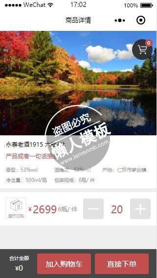 模板简介:该模板名称为【微信小程序大图酒类商品详情页面设计制作开发教程】,大小是,文档格式为.,推荐使用打开,作品中的图片,文字等数据均可修改,图片请在作品中选中图片替换即可,文字修改直接点击文字修改即可,您也可以新增或修改作品中的内容,该模板来自用户分享,如有侵权行为请联系网站客服处理。欢迎来懒人模板【小程序教程】栏目查找您需要的精美模板。