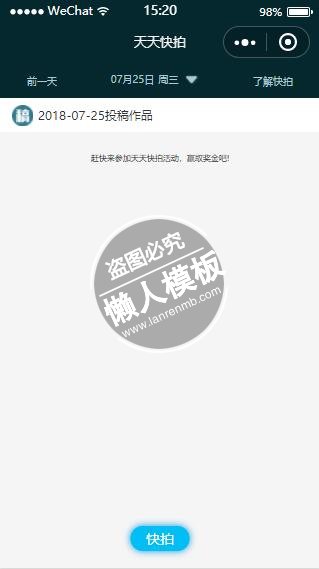 模板简介:该模板名称为【微信小程序天天快拍拍活动赢奖金首页设计制作开发教程】,大小是,文档格式为.,推荐使用打开,作品中的图片,文字等数据均可修改,图片请在作品中选中图片替换即可,文字修改直接点击文字修改即可,您也可以新增或修改作品中的内容,该模板来自用户分享,如有侵权行为请联系网站客服处理。欢迎来懒人模板【小程序教程】栏目查找您需要的精美模板。