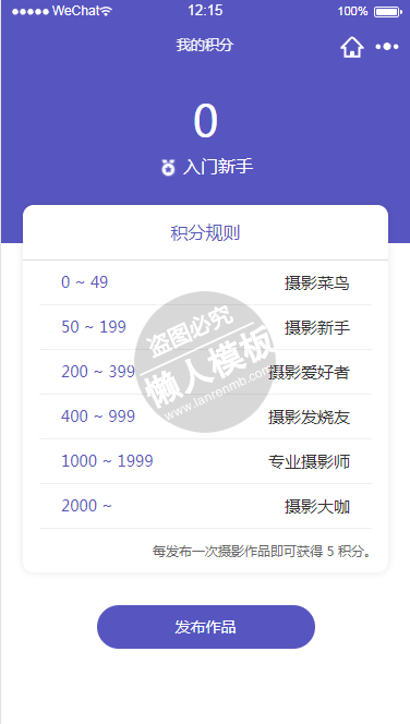 模板简介:该模板名称为【微信小程序我想学摄影积分规则页面设计制作开发教程】,大小是,文档格式为.,推荐使用打开,作品中的图片,文字等数据均可修改,图片请在作品中选中图片替换即可,文字修改直接点击文字修改即可,您也可以新增或修改作品中的内容,该模板来自用户分享,如有侵权行为请联系网站客服处理。欢迎来懒人模板【小程序教程】栏目查找您需要的精美模板。