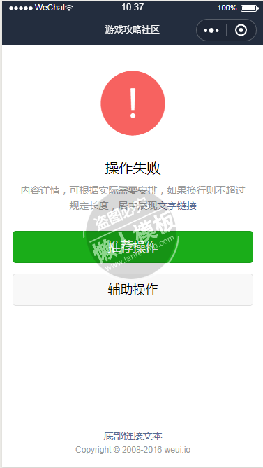 模板简介:该模板名称为【微信小程序WEUI设计失败页面设计制作开发教程】,大小是,文档格式为.,推荐使用打开,作品中的图片,文字等数据均可修改,图片请在作品中选中图片替换即可,文字修改直接点击文字修改即可,您也可以新增或修改作品中的内容,该模板来自用户分享,如有侵权行为请联系网站客服处理。欢迎来懒人模板【小程序教程】栏目查找您需要的精美模板。