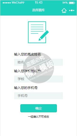 模板简介:该模板名称为【微信小程序绿色选择题库个人信息填写页面设计制作开发教程下载】,大小是,文档格式为.,推荐使用打开,作品中的图片,文字等数据均可修改,图片请在作品中选中图片替换即可,文字修改直接点击文字修改即可,您也可以新增或修改作品中的内容,该模板来自用户分享,如有侵权行为请联系网站客服处理。欢迎来懒人模板【小程序教程】栏目查找您需要的精美模板。