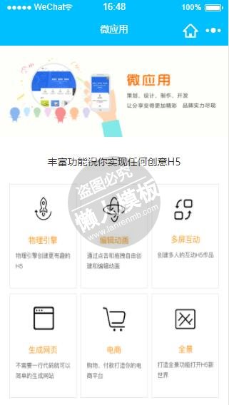 模板简介:该模板名称为【微信小程序微应用丰富功能介绍页设计开发教程下载】,大小是,文档格式为.,推荐使用打开,作品中的图片,文字等数据均可修改,图片请在作品中选中图片替换即可,文字修改直接点击文字修改即可,您也可以新增或修改作品中的内容,该模板来自用户分享,如有侵权行为请联系网站客服处理。欢迎来懒人模板【小程序教程】栏目查找您需要的精美模板。